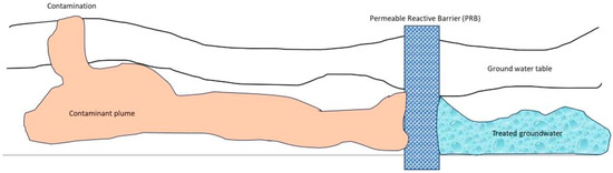 Groundwater contamination poses a significant environmental challenge, requiring effective and sustainable remediation strategies. Traditional approaches like pump-and-treat systems have cost and long-term energy-intensive operation limitations [55,56]. As a result, the development of innovative remediation technologies has become crucial. One emerging technology that has been deeply studied is the permeable reactive barrier (PRB), as schematically described in Figure 7.