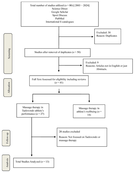 A systematic literature search was conducted following the Preferred Reporting Items for Systematic Reviews and Meta-Analyses (PRISMA) guidelines. Studies were sourced from various databases, including Science Direct, Google Scholar, Sport Discuss, and PubMed. A comprehensive keyword search was performed using MeSH headings and keywords, including “massage therapy”, “Taekwondo athletes”, “muscle recovery”, “injury prevention”, “psychological well-being”, “Swedish massage”, “deep tissue massage”, “sports massage”, “performance optimization”, and “sleep quality”. The search was limited to studies published between 2003 and 2024. Only peer-reviewed articles written in English were considered, and the search results were categorized for discussion, as illustrated in Figure 1.