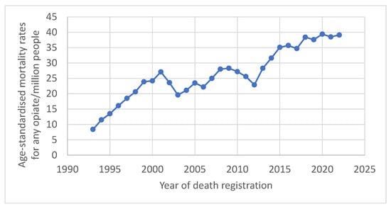 - Office for National Statistics (OFNS). Deaths Related to Drug Poisoning in England and Wales: 2022 Registrations. 2023. Available online: https://www.ons.gov.uk/peoplepopulationandcommunity/birthsdeathsandmarriages/deaths/bulletins/deathsrelatedtodrugpoisoninginenglandandwales/2022registrations#cite-this-statistical-bulletin (accessed on 7 May 2025).