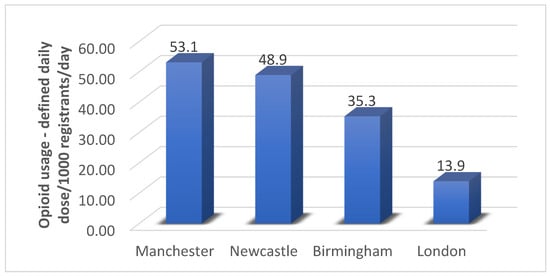 This cross-sectional study demonstrated variation in opioid utilization between the 209 CCGs investigated, with the highest prescribing rates existing in the northern and eastern regions of the country. A higher number of opioid prescriptions were dispensed in areas with lower IMD scores, indicating a positive relationship between socioeconomic deprivation and opioid utilization. With respect to the four cities compared, the highest number of opioid prescriptions were dispensed in Manchester, with London having the fewest prescriptions (Figure 2).