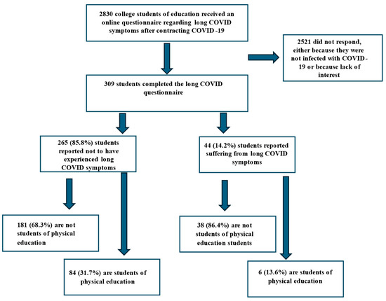Among the respondents, 265 (85.8%) reported not experiencing long COVID symptoms, while 44 (14.4%) reported suffering from long COVID symptoms. Of those who are suffering from long COVID symptoms 265 (68.3%) are not students of physical education, and 84 (31.7%) are. Of the 44 reporting to be suffering from long COVID symptoms, 38 are not students of physical education and 6 are (Figure 1).