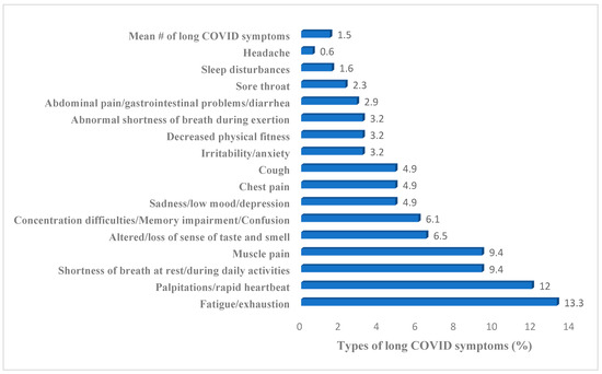 The most common long COVID symptom among the students was fatigue, reported by 13.3% of those surveyed. This was followed by elevated heart rate (12%), muscle pain, and shortness of breath—each reported by 9.4% of the participants. All other symptoms were reported by less than 7% of the population studied. Overall, the average number of long COVID symptoms among 54.7% of those who experienced long COVID was 1.5 types of symptoms (Figure 2).