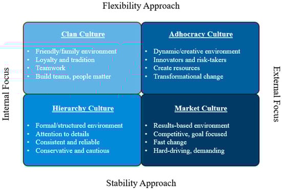 The organizational culture was assessed using the validated Organizational Culture Assessment Instrument (OCAI), grounded in the Competing Values Framework [23,25]. This framework evaluates organizational effectiveness based on two key dimensions: internal versus external focus and stability versus flexibility (Figure 1). These dimensions intersect to form a 2 × 2 matrix, defining four distinct organizational culture types. An internal focus emphasizes collaboration, development, and integration, whereas an external focus prioritizes market competition, customer satisfaction, and diversification. Stability-oriented organizations emphasize clear structures, detailed planning, and controlled environments. In contrast, flexibility-oriented organizations value adaptability and innovation, assuming that not everything can be predicted or controlled.