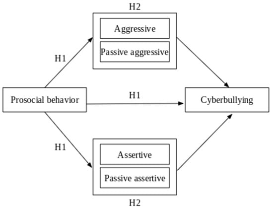 Since prosocial behavior is a key factor in effectively managing social relationships, we hypothesized that it would be negatively related to aggression and the experience of cyberbullying and positively associated with assertive behavior (Hypothesis 1). Furthermore, given that assertive and aggressive behaviors are significantly linked to cyberbullying, we hypothesized that these behaviors would serve as significant mediators in the relationship between prosocial behavior and cyberbullying (Hypothesis 2). The conceptual model is presented in Figure 1.