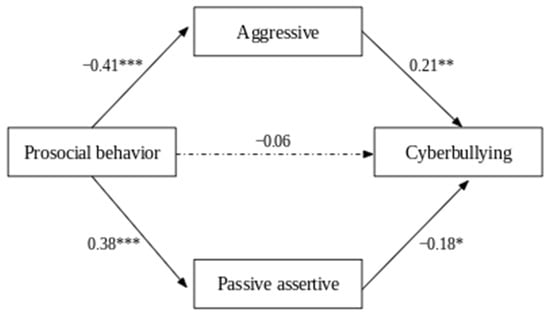 The mediation model with standardized effects of the relationship between prosocial behavior and cyberbullying. The dotted lines indicate nonsignificant relations and the dash line significant relations. * p < 0.05, ** p < 0.01, *** p < 0.001.
