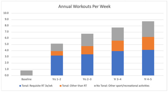 Average annual workouts per week for the requisite thrice-weekly Tonal resistance training (RT), ad libitum workouts using Tonal (e.g., yoga, aerobics, stretching) and other sport/recreational activities not related to Tonal (e.g., jogging, swimming, volleyball).