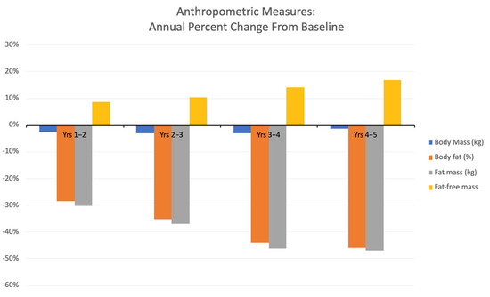 Anthropometric measures are described in Table 1. Body mass decreased slightly after year 1 and then remained stable for the next four years. In contrast, both body fat percentage and fat mass showed a consistent decline from the beginning of the study to its conclusion. Fat-free mass increased steadily over the course of training, culminating in an overall gain of 10 kg, or approximately 17% over five years (Figure 3).