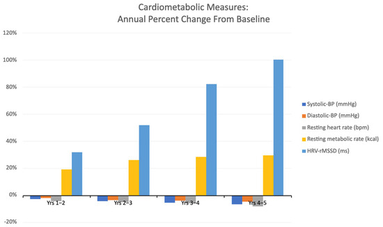 Cardiometabolic measures are described in Table 1. Initially, the participants exhibited borderline hypertension (i.e., 129/83), which normalized to a blood pressure of 120/80 by the end of training. By the end of the fifth year, the resting heart rate had progressively decreased by seven beats per minute, from 79 to 72. Additionally, the resting metabolism rose by up to 30%, and the heart rate variability (HRV) doubled (see Figure 5).