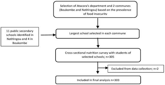with Z being the confidence level (typical value of 1.96); p the prevalence of low dietary diversity in Atacora (which is 22.4% [6]), and m a 5% margin of error (standard value of 0.05). The value for dietary diversity was taken from household surveys, as there was no specific data related to adolescents’ dietary diversity in this area. The sample size calculation resulted in a sample size of 268 students. Considering a 10% rate of refusal and non-response, the final sample size consisted of 303 students in total, randomly selected from the two secondary schools. A proportional distribution was made according to the number of enrolled students in each school to ensure a representative sample. The selection criteria were for students to: (i) be enrolled in a non-exam class of the selected secondary schools; (ii) have received their parents’ approval to participate in the study; (iii) willingly participate in the study; and (iv) be available for interview both on weekdays and weekends. After receiving the approval of the schools’ directors, the students were first met by the study management team in their respective classes. At this first meeting, the study’s goal was explained, followed by a questions and answers session. After that, 318 students volunteered to participate in the study, from which 305 students were randomly selected. The selected students met for a second time to complete the participant consent form. Out of the 305 selected students, two students were not available and were consequently excluded. In the end, 303 students participated (101 students in Boukombe’s secondary school, where 1150 students were enrolled, and 202 students in Natitingou’s secondary school, where 2350 students were enrolled at the time of data collection) and individual interviews were conducted by administering three different questionnaires (Figure 1).