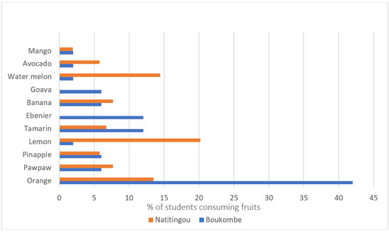 Eleven different fruits were consumed by the students in both secondary schools. The most-consumed fruit in the Boukombe secondary school was oranges (42%), while in the Natitingou secondary school it was lemons (consumed as juice) (20.19%) (Figure 2). Hibiscus-flower juice/tea was also identified as a beverage consumed by students but was not counted among the 11 fruits reported as consumed in the 24-h recall.