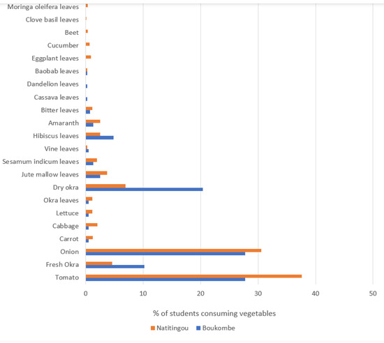 The 24-h recall identified 22 different vegetables being consumed by Natitingou and Boukombe secondary school students (Figure 3)—the most important being tomatoes (Boukombe 27.73% and Natitingou 37.58%) and onion (Boukombe 27.73% and Natitingou 30.57%), followed by dry okra (Boukombe 20.35% and Natitingou 6.89%).