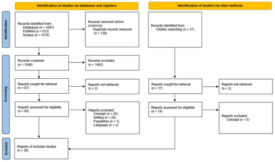 In total, as shown in Figure 1, 1687 papers were retrieved from the two electronic databases searched. Of these, 138 were identified as duplicates and removed, leaving 1549 papers to be screened. After the title, abstract, and keyword screening was carried out, 1462 were found not to be relevant. The remaining 87 papers were screened at full text, and 29 met the predefined and tested eligibility criteria. Any papers that the first author needed further consultation on were screened at full text by a second reviewer. A further nine texts were found via citation searching carried out from these works, meaning that 38 papers were included in the final selection. Most studies were excluded as they did not meet the inclusion criteria for the concept of social eating, which this review defines as eating with others. Other reasons for exclusion included focusing on discharged patients’ experiences of mealtimes outside of the hospital, or research taking place in settings such as residential nursing homes. The relevant data from each article were then extracted and charted by one reviewer.