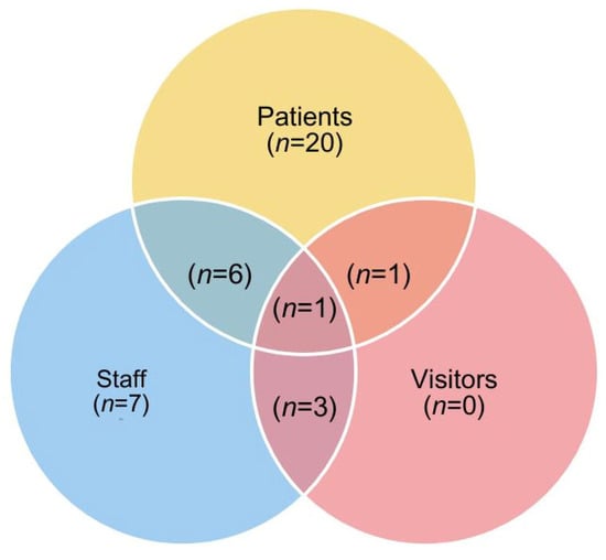 Qualitative studies in this review included the views and experiences of multiple participant groups involved in hospital mealtime care aside from patients, such as hospital staff or patients’ families, to develop a holistic understanding of the strengths and challenges of dining with others in the hospital. Figure 2 charts the information relating to participant groups across the included studies. Twenty studies only included patients as participants in their research, six included both patients and staff as participants, and seven focused only on the perspectives of staff. Three papers included both staff and patients’ visitors in their study, and one explored the perspectives of both patients and their visitors. Only one paper involved patients, visitors, and staff in their study.