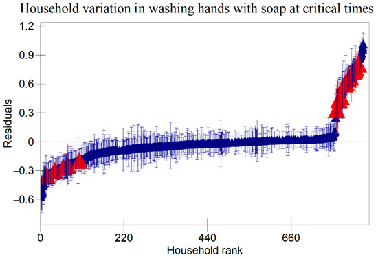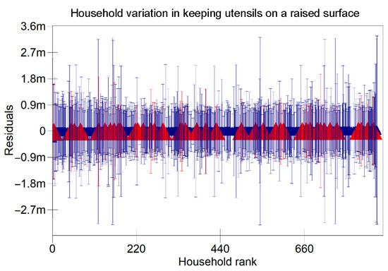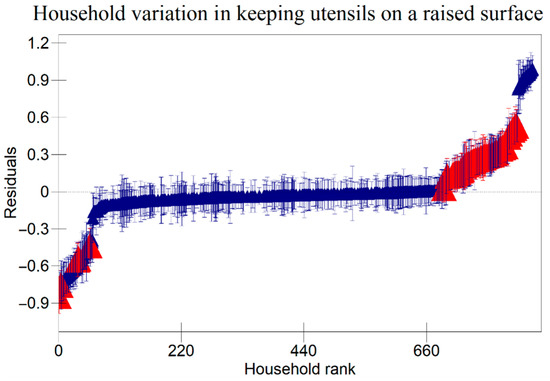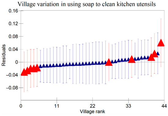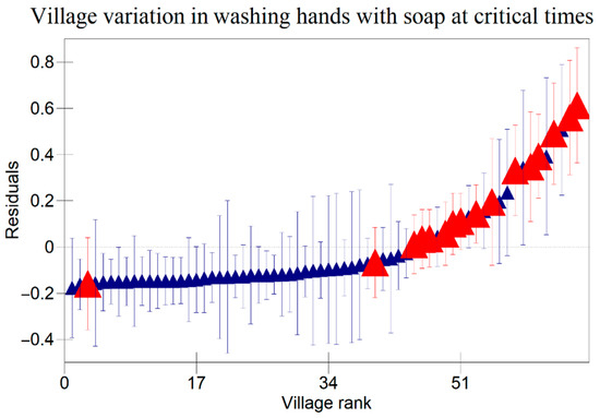 The results in Table 5 indicate that there were variations at the household level regarding keeping utensils on an elevated surface, using soap to clean kitchen utensils, and washing hands with soap at critical times as indicated in Figure 1, Figure 2 and Figure 3 respectively. Figure 4, Figure 5 and Figure 6 show that there there were variations between villages regarding keeping utensils on an elevated surface, using soap to clean kitchen utensils, and washing hands with soap at critical times respectively (p < 0.0001). This agrees with the results displayed in caterpillar plots where some villages and households are above zero on the positive side of the graph, and other households and villages are below zero on the negative side of the graph. Those that are above zero are non-doers, while those on the negative side are doers. As indicated on the legends for individual graphs, villages and households from intervention areas are shown in blue, while villages and households serving as the control are shown in red. However, it has been noted that some villages and households from non-intervention areas fall on the negative side of the caterpillar plot, implying that such villages and households were doers though they did not receive the intervention. Similarly, some villages and households from intervention areas fall above the caterpillar plot, implying that they were non-doers though they received interventions. For instance, Figure 1 shows that households from non-intervention areas were on the far negative side of the caterpillar plot. The software shows that these households are in the Kaphiri village, which is part of the control, but they are on the doers’ side, as indicated in a previous study. Factors that can lead to such outperformance may include proximity to some villages that were in the intervention area, village leadership influence, or influence form other related interventions
