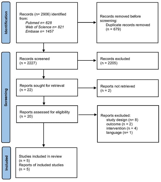 Initially, 2906 records were identified. After removing the duplicates, 2227 records remained which, based on the inclusion and exclusion criteria, were screened for title and abstract. After this selection, 22 records remained of which, for 2 records, the ‘full text’ (after contacting the first and last author) could not be obtained. The full texts of the remaining 20 records were evaluated for inclusion and exclusion criteria, after which five studies were finally included in the literature review (Figure 1).