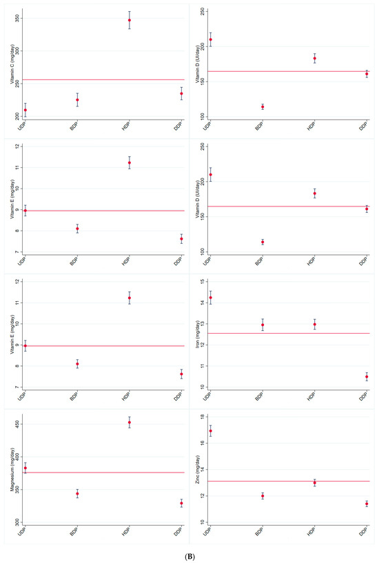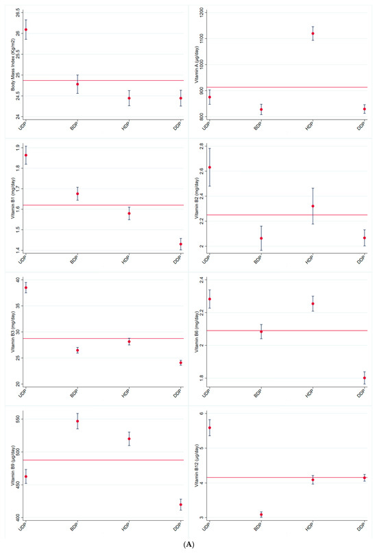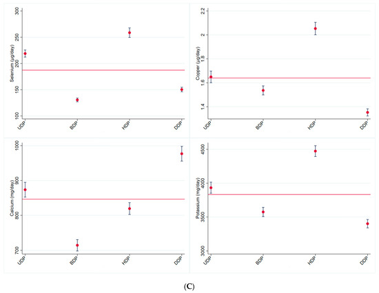 (A) Average value (CI 95%) for body mass index (Kg/m2) and micronutrient intake (mg or µg/person/day) for the total sample (red line) and according to dietary patterns. (B) Average value (CI 95%) for micronutrient intake (mg or µg/person/day) for the total sample (red line) and according to dietary patterns. (C) Average value (CI 95%) for micronutrient intake (mg or µg/person/day) for the total sample (red line) and according to dietary patterns. (UDP: unhealthy dietary pattern; BDP: Brazilian dietary pattern; HDP: healthy dietary pattern; DDP: dairy dietary pattern). CUME Study, 2016–2022.