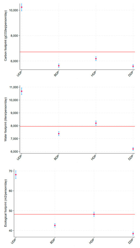 Average value (CI 95%) of the environmental footprints (carbon footprint (gCO2e/person/day), water footprint (L/person/day), and ecological footprint (m2/person/day)) according to dietary patterns (UDP: unhealthy dietary pattern; BDP: Brazilian dietary pattern; HDP: healthy dietary pattern; DDP: dairy dietary pattern), with the red line indicating the overall mean of the sample. CUME Study, 2016–2022.