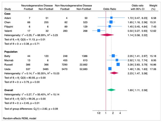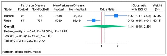 In neurodegenerative disease cohorts, the OR was produced based upon the calculation of the footballers with neurodegenerative disease in their cohort and the footballers in the control without. The meta-analysis of the ORs was undertaken within STATA 18.0 2025 using the Radon-effects REML model.