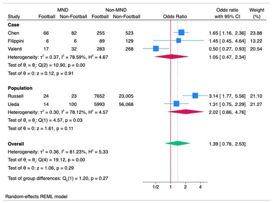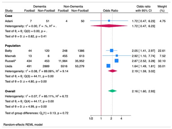 Further to Ueda et al. [] this study had a mixture of professional and non-professionals, giving the spread of studies, mainly in case-control studies. Fillipini et al. [] allowed for the differentiation of competitive football, which was included in this study’s analysis, but it is unclear if this means professional football.