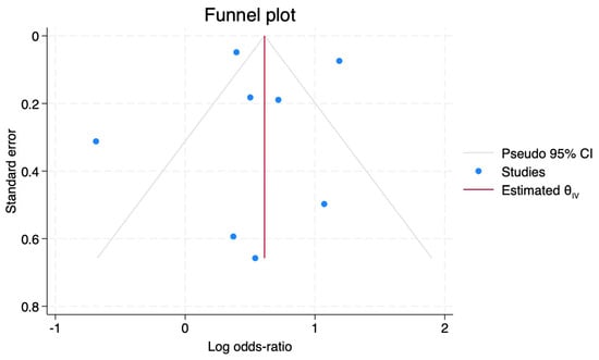 The Egger’s regression test demonstrated no small study effect and a low risk of publication bias (p = 0.7006). The funnel plot also demonstrated symmetry between publications (see Figure 6).