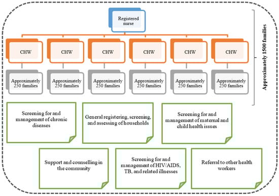 Within the redesigned South African PHC plan, great emphasis is placed on health promotion and disease prevention when CHWs, as key role-players, screen and assess households with a specific focus on maternal and child health, HIV/AIDS, TB, and chronic diseases. CHWs are also expected to support and counsel members of the community and/or refer them to other health practitioners when necessary [17]. CHWs function within municipal ward-based outreach teams, which consist of a professional nurse and six CHWs (reporting directly to the nurse) (see Figure 1). Each community team takes responsibility for approximately 1500 families. The community population size thus informs the number of teams, and every CHW will be assigned around 250 families (see Figure 1).