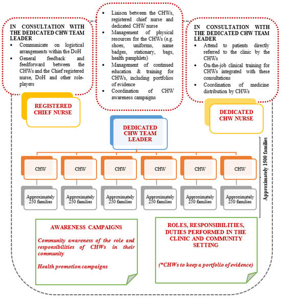 Regarding our recommendations for the appointment of a CHW team leader, such a CHW team leader could act as the liaison between the CHWs and the rest of the PHC team and could fulfil coordination functions, amongst others, linked to ordering and provisioning of physical resources needed by CHWs to fulfil their duties, improved service delivery, improved communication and the facilitation of continuous development and training of CHWs (see Figure 2).