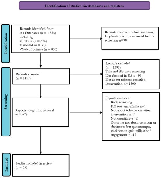 This systematic review followed the widely used population, intervention, comparison, and outcome (PICO) framework to guide study selection and synthesis [20]. The review focused on smokers residing in the U.S., evaluating tobacco cessation interventions that include behavioral therapies, pharmacotherapies, smoking cessation programs, and non-medical interventions. The primary outcome of interest was smoking cessation. PRISMA guidelines informed the reporting of study results.