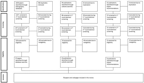 Publications identified through database and website searches and by expert recommendation were imported into Endnote bibliographic software, Version 21 to support our screening processes. Duplicates were removed and then titles and abstracts (or website excerpts where applicable) were screened against pre-defined inclusion and exclusion criteria. Full text was obtained for all publications that were screened in, and these were subsequently reviewed by three researchers from the review team (EA, CH and ZP). Uncertainties as to eligibility were resolved by consultation with the full review team.