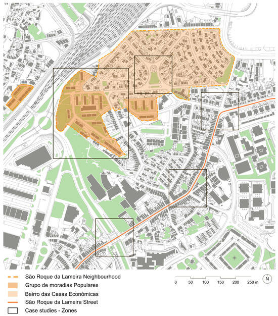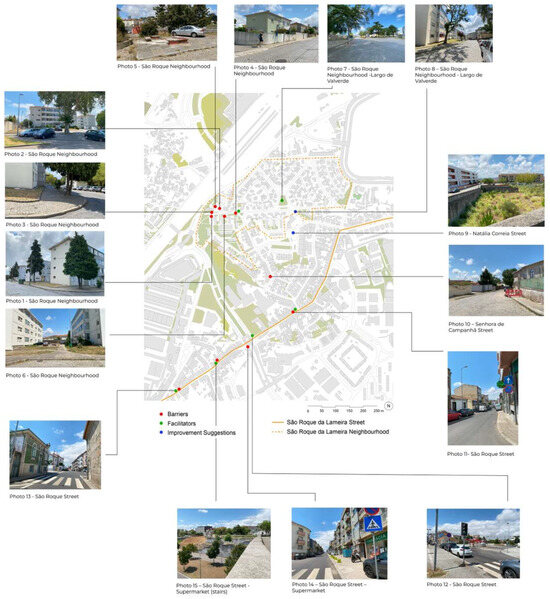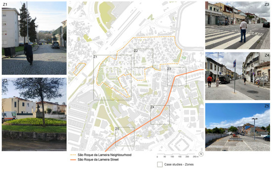 The São Roque da Lameira area illustrates the socioenvironmental conditions and morphological characteristics encompassing a diverse population. It reflects the area’s ageing demographics, health challenges, social disparities, and physical constraints. Addressing these challenges requires comprehensive public space design strategies, improved accessibility to health services, and community support initiatives to improve the quality of life for the ageing population. To define these strategies, as examples, public spaces were selected in São Roque da Lameira Street and neighbourhood (Figure 1).
