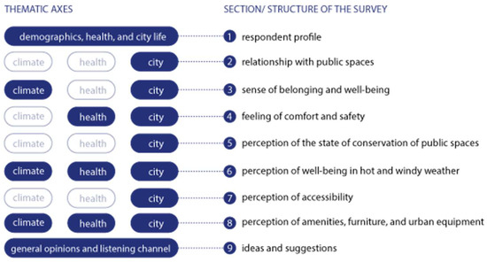 (II) The ‘go-along’ interviews involved individuals who were guided through two areas—the São Roque da Lameira neighbourhood and street—where they live and regularly walk to reach specific destinations. During these interviews, participants were asked a pre-set list of questions (see Appendix B) focused on thematic axes: demographics, health, urban life, climate, and general opinions. The main objective was to collect information about the lives and experiences of older people in public spaces. The survey was organised into blocks of interrelated questions, directly linked to the fields of climate, health, and the city (Figure 2).