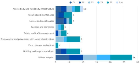 (II) The ‘go-along’ data interviews were conducted in a sequential three-step process, starting with the transcription of field notes (i). The following step, data collection, was organised using a thematic approach defined during the creation of the questionnaire using LimeSurvey Community Edition version 6.14.0+250520. This was supported by the work of Kusenbach and Holgersson [30,31] (ii), which framed the key themes explored during the ‘go-along’ interviews. However, an additional subject on climate adaptation was introduced, exploring perceptions of climate change and its health impacts. The results, organised in an Excel spreadsheet (iii), allowed for segmented reading by evaluation zones, enabling each piece of data to be analysed in relation to the questions asked at each location. This is justified by the fact that each point of approach had specific characteristics, allowing both an isolated analysis of opinions and a cross-sectional view, including the gender perspective. Based on these results, many of which were obtained through open-ended questions, the responses were categorised. This process differentiated questions that could be reformulated to include closed alternatives from the ones requiring the support of complementary participatory methods to achieve greater precision in capturing the opinions of the participants. Finally, the findings showed the potential of combining diagrams/graphs and textual analysis, providing a more comprehensive interpretation of the data. The diagrams/graphs offered a visual representation of the main patterns, relationships and themes, making complex information easier to understand. Textual analysis complemented this visualisation by providing detailed explanations, contextualising the findings, and highlighting nuances that might not be immediately apparent graphically.