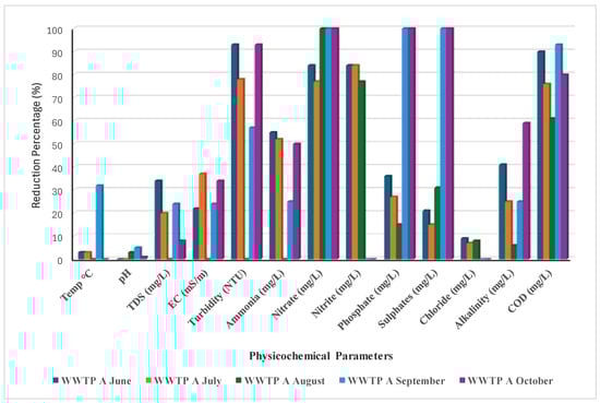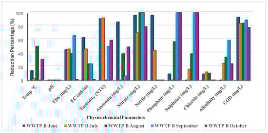 Throughout this study, both plants showed a reduction of >70% in nitrate and nitrite, although WWTP B did not reduce nitrite between September and October (Figure 1). In September and October, WWTPs A and B reduced sulphates and phosphates by 100%, but from June to August, the reduction was less than 50% (Figure 1 and Figure 2). This decrease was brought about by the presence of organic substrate, which is essential for achieving the appropriate treated volume and the required effluent water quality, particularly during these rainy months (September and October) [].
