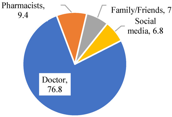 The primary source of information about antibiotic use among participants was their doctor, with 76.8% (516 participants) relying on this source (Figure 1). Pharmacists were the second-most common source, consulted by 9.4% (63 participants). Family/siblings or friends provided information for 7.0% (47 participants), while social media was a source for 6.8% (46 participants).