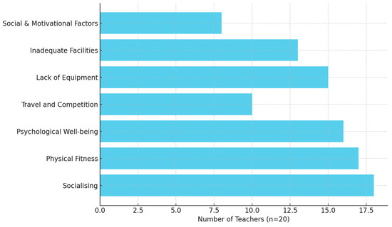 The thematic analysis conducted on teachers’ perspectives regarding sports participation for learners with IDs revealed two primary themes. The first theme, perceived benefits of sport participation, encompassed four subthemes: socialising and peer interaction; physical health and fitness; psychological and emotional well-being; and exposure, talent identification, and travel opportunities. The second theme addressed barriers to sport participation, which were categorised into three subthemes: lack of adapted equipment, inadequate facilities, and social and motivational factors. A summary of the overarching themes, their subthemes, and illustrative quotes from participants is presented in Table 1, with frequencies depicted in Figure 1. A detailed explanation of these themes follows below.