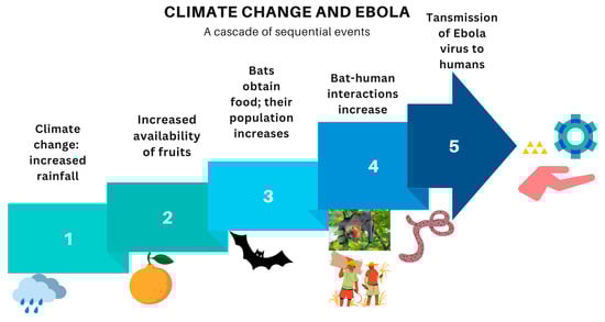 Climatic factors play a role in Ebola outbreaks in Africa even though the Ebola virus is mainly transmitted through contact with the bodily fluids of infected persons [34]. Changes in rainfall, vegetation, and forest cover affect the frequency and severity of Ebola outbreaks. For example, heavy rains cause an abundance of fruits, which provides food for natural hosts of the virus such as bats (Figure 1) [35]. During these periods, heightened interactions between humans and infected animals can lead to outbreaks [31]. Moreover, deforestation and encroachment into forested areas can contribute to the emergence and spread of Ebola [30,36]. Therefore, climate change and the resultant human activities increase the risk of Ebola in Africa.