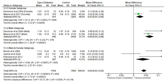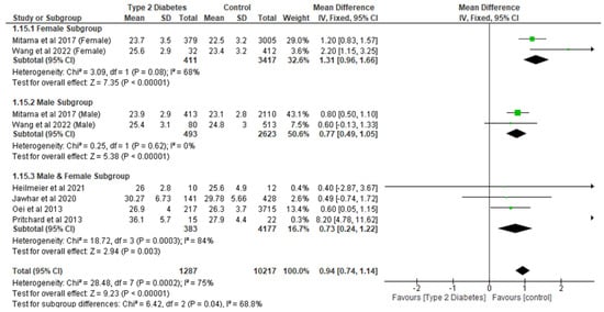 Following the meta-analysis, it was found that the T2D group had a significantly (p < 0.05) increased BMI compared to controls. The analysis involved eight studies and 11,504 participants, with an MD of 0.94 (95% CI,0.74, 1.14, p < 0.0001) (Figure 11). Following the sensitivity analysis, the effect of T2D on BMI compared with controls remained significantly different (p < 0.05). The subgroup analysis showed that T2D significantly increased (p < 0.05) BMI in the different subgroups.