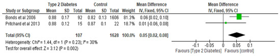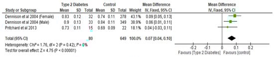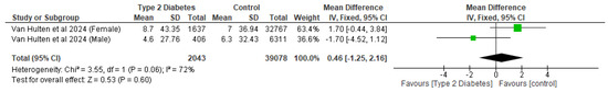 The effect of type 2 diabetes on total hip bone mineral density (g/cm2) [25,29].