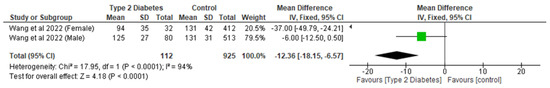 While there was a significant reduction (p < 0.0001) in the patients with T2D group with respect to volumetric BMD, involving two studies and 1037 participants, with an MD of −12.36 (95% CI,−18.15, −6.57, p < 0.0001) (Figure 6), T2D did not appear to have a significant effect (p > 0.05) on total BMD and areal BMD compared to controls (Table 4).