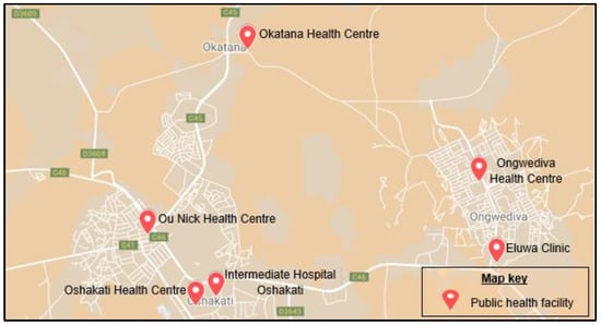 This research was conducted in the Oshakati District, Oshana region, a key healthcare hub in Northern Namibia with a population of 33,618 [23]. The region covers 8653 km², with a population density of 20.43/km² [23]. This study focused on public health facilities under the Ministry of Health and Social Services (MoHSS): Intermediate Hospital Oshakati, Ou-nick Health Centre, and Oshakati Health Centre (Figure 1). Intermediate Hospital Oshakati, with 750 beds, treats nearly a million patients annually and serves as both a referral and training hospital [20,24]. Intermediate Hospital Oshakati, although located in a relatively small geographic area, functions as a referral hospital for Namibia’s entire northern region, receiving patients from multiple surrounding districts. Therefore, while the immediate land area and population size of Oshakati District may seem limited, the actual catchment population served by the hospital is significantly larger. Ou-nick and Oshakati Health Centres provide accessible primary healthcare services, strengthening Oshakati’s urban healthcare infrastructure.