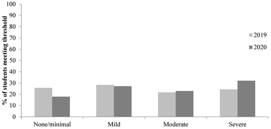 As shown in Figure 1 and Figure 2, using the published criteria for moderate anxiety (10–14) and depression (10–14), the proportion of students above these cut-offs was 46.0% for anxiety and 49.5% for depression before the COVID-19 pandemic. The proportion of students above these cut-offs during the COVID-19 pandemic increased to 54.9% for anxiety and 58.1% for depression. Using the published criteria for severe anxiety (GAD-7: 15–21), 24.3% met the criteria for severe anxiety before the COVID-19 pandemic, whereas 32.0% met the criteria for severe anxiety during the COVID-19 pandemic. Using the published criteria for moderately severe and severe depression (PHQ-9: 15–19 moderately severe and 20–27 severe), 29.1% met the criteria for moderately severe/severe depression before the COVID-19 pandemic, whilst 36.6% met the criteria for moderately severe/severe depression during the COVID-19 pandemic.