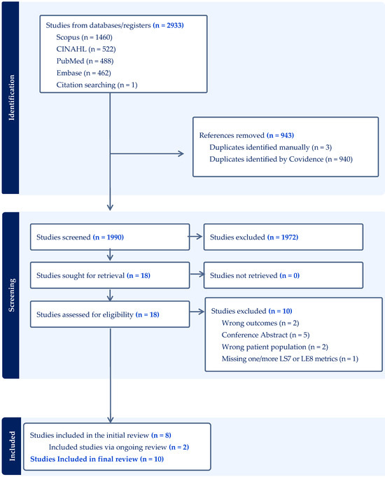 The following describes the iterative process of review. As of December 2024, a total of 2933 citations were gathered through the initial literature search in PubMed, CINAHL, and Embase. Post removal of 943 duplicate articles, two reviewers (TSN and OA) independently reviewed each of the 1990 articles’ titles and abstracts for inclusion and exclusion. Disagreements were resolved through review and consensus by all reviewers. We excluded 1972 citations from irrelevant articles based on a review of titles and abstracts. The remaining 18 articles underwent full-text review in the same manner based on inclusion and exclusion criteria. Ten additional studies were excluded based on full-text reviews, leaving ten articles that met the inclusion criteria. We then performed ascendancy and descendancy searches to identify relevant articles for inclusion. Two additional articles were identified for a total of ten included articles. The complete results of the search and review process are detailed in the PRISMA flow diagram (Figure 1). Following this analysis, 2 additional articles were added that met the inclusion criteria for a total of 10 articles analyzed at full review.