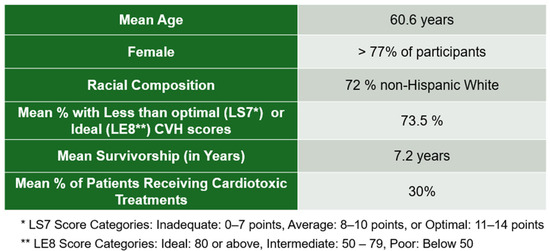 The ten articles demonstrated CVH challenges among cancer survivors, as more than 50% of cancer survivors had less than optimal (LS7 score < 10) or ideal (LE8 score < 80) CVH outcomes. Utilizing data from the NCI Community Oncology Research Program reported and found that 48.3% of cancer survivors had high cholesterol, 47.8% had hypertension or high BP, 33.1% had obesity, and 20.5% had diabetes when assessing LS7 metrics. In addition, these same metrics were assessed in patients and providers from a cancer survivor clinic and found among survivors less than ideal LE8 CVH scores in BMI, dietary practices, and physical activity categories [23,28].