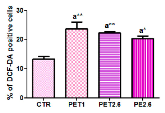 ROS generation in Caco-2 cells exposed for 72 h to MPs (PET 1 µm, PET 2.6 µm and PE 2.6 µm) at IC50 concentrations. Histogram showing the percentage of DCF-DA positive cells. All values are expressed as means ± standard deviation (* p < 0.05, ** p < 0.01). Statistical significance was evaluated by ANOVA (at least p < 0.05) followed by Tukey test for multigroup comparison. All the experiments were performed in triplicate.