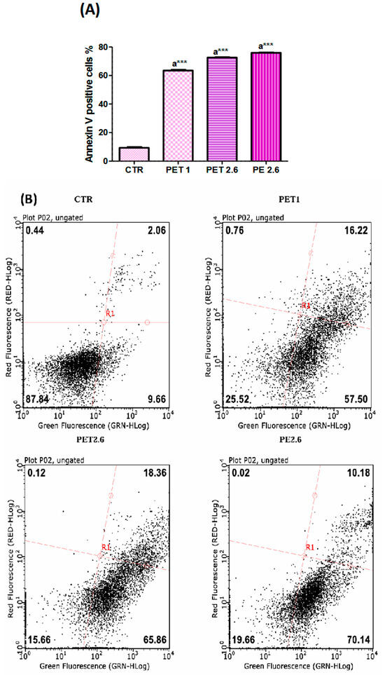 Apoptotic rates were analyzed using flow cytometry (Figure 3B). The results demonstrated that microplastics increased apoptosis in all the analyzed conditions (Figure 3A). Specifically, the apoptotic cell populations were significantly higher in the MP-treated groups compared to the control, suggesting that microplastic exposure may promote cell death through apoptotic mechanisms. This trend was observed across all experimental conditions, further supporting the hypothesis that MPs induce cellular stress and contribute to apoptosis.
