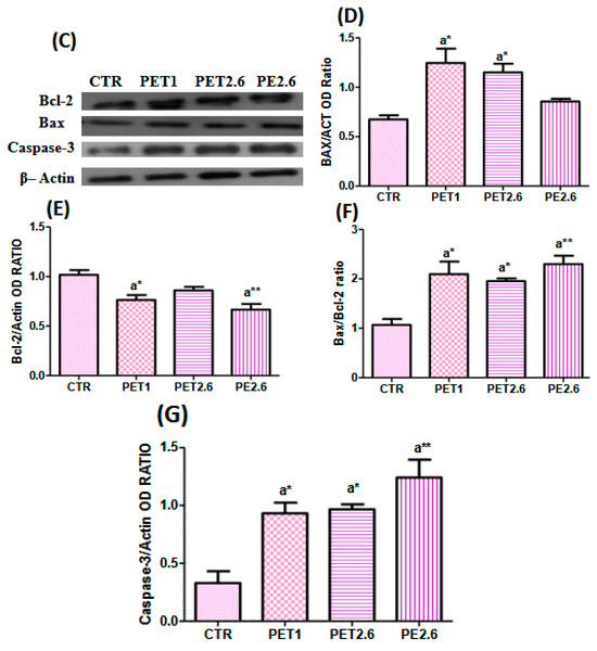 Bcl-2, Bax, and Caspase-3 were chosen as key markers for apoptosis (Figure 3C). The Western blot analysis (Figure 3D) revealed that the protein levels of Bax were elevated in the Caco-2 cells treated with PET1 and PET2.6 (p < 0.05). In contrast, Bcl-2 levels (Figure 3E) decreased in the cells treated with PET1 (p < 0.05) and PE (p < 0.01). As a result, the Bax/Bcl-2 ratio significantly increased across all conditions (Figure 3F). Additionally, caspase-3 levels were elevated in all the conditions tested (Figure 3G), with PET showing a significant increase (p < 0.05) and PE showing a more pronounced increase (p < 0.01).