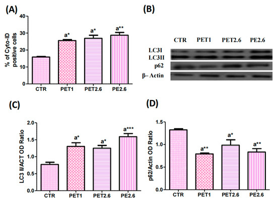 Assessment of autophagic flux in Caco-2 cells exposed to microplastics (PET 1 µm, PET 2.6 µm, and PE 2.6 µm) using Cyto-ID assay and Western blot analysis. (A) Histogram showing the percentage of Cyto-ID positive cells. (B) WB analysis shows the expression of LC3-I (16 kDa), LC3-II (14kDa) and p62 (62 kDa) in Caco-2 exposed to MPs. (C) The histogram shows the LC3-II level. Data were normalized with beta-Actin (44 kDa). (D) Histogram showing the relative level of p62. Proteins levels were quantified using the ImageJ program. Data were normalized with beta- Actin and reported as OD ratio. All the values are expressed as means ± SEM. Asterisks indicate a significant difference from the respective control (*: p < 0.05), (** p < 0.01) and (***: p < 0.001) after one-way ANOVA using Tukey’s Post Hoc test.