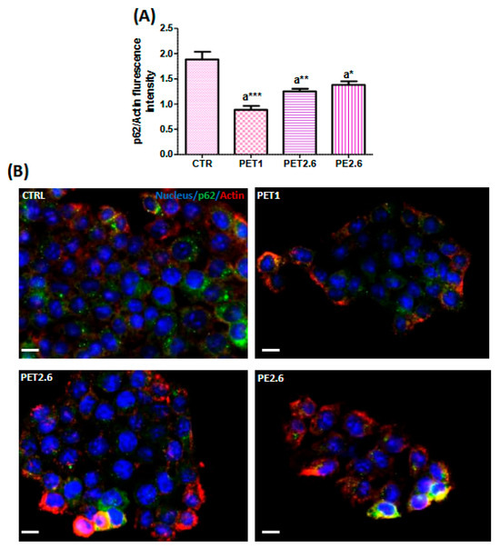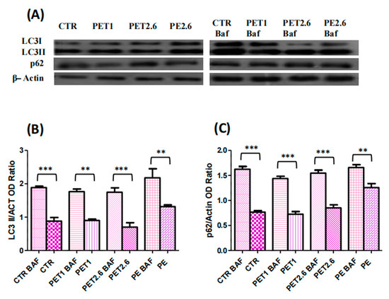 To investigate the potential role of autophagy in cellular responses to microplastics (MPs), our study focused on understanding how MPs affect cellular processes through autophagic mechanisms. We used cytochalasin D to disrupt the actin cytoskeleton and assessed autophagic activity using complementary methods. A Western blot analysis of autophagy-related proteins LC3 and p62 was performed under conditions with and without bafilomycin A1 (Baf A1), a selective inhibitor of vacuolar-type H+-ATPase that blocks the fusion of autophagosomes with lysosomes. Compared to the control group, LC3-II levels were significantly elevated in Caco-2 cells treated with PET 1µm, PET 2.6µm (p < 0.05), and PE (p < 0.001), while p62 levels were significantly reduced in these same groups (PET 1µm: p < 0.01, PET2.6µm: p < 0.05, PE: p < 0.01), indicating enhanced autophagic flux (Figure 4B–D). These findings were supported by the Cyto-ID® Autophagy Detection assay, which uses a cationic amphiphilic tracer dye to label autophagic vacuoles. As shown in Figure 4A, the Caco-2 cells treated with PET1, PET2.6 (p < 0.05), and PE (p < 0.01) exhibited a significant increase in autophagic vacuoles compared to the control group. We further confirmed these results through immunofluorescence imaging, which revealed distinct localization patterns of LC3 and p62. A quantitative analysis showed a significant increase in LC3-II fluorescence intensity in PET- and PE-treated cells (p < 0.05), while p62 fluorescence decreased across all conditions (Figure 5A–D), reinforcing the conclusion of increased autophagic activity. To validate the presence of active autophagic flux, we evaluated LC3-II and p62 expression in the presence of Baf A1. As expected, the Baf A1 treatment led to a marked accumulation of both LC3-II and p62 (Figure 6A–C), consistent with the blockade of autophagosome degradation. The increased LC3-II reflects autophagosome accumulation, while elevated p62 suggests impaired degradation, confirming that MPs stimulate autophagy and alter degradation pathways in Caco-2 cells.