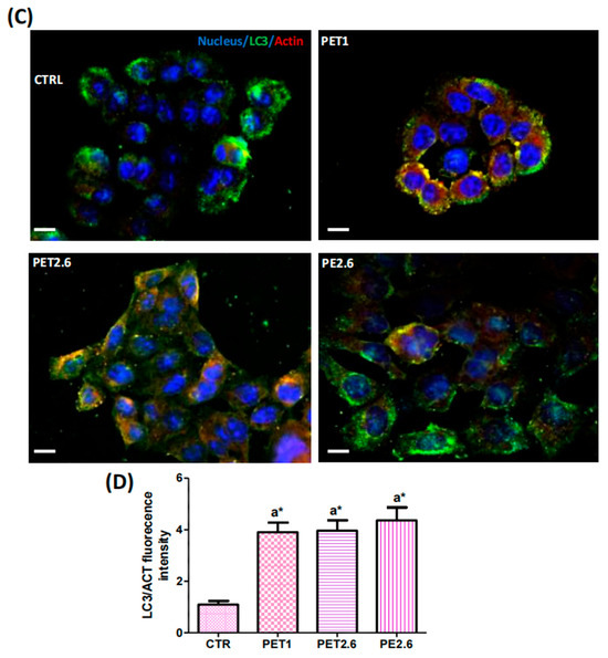 Autophagic flux analysis by immunofluorescence. (A) the histogram shows the quantification of p62 fluorescence signal intensity. (B) p62 (green), Actin (Red) immunolocalization Caco-2 cells treated with MPs. Cell nuclei were stained with DAPI (blue). The images were captured at ×20 magnification. Scale bars represent 20 µm. Data were normalized with the signal of Actin using ImageJ. All values are expressed as means ± standard deviation. PET 1, PET 2.6 and PE 2.6 Vs CTRL: (*: p < 0.05, ** p < 0.01 and ***: p < 0.001). (C) Representative micrographs of LC3 immunostaining (green), and Actin (red) on Caco-2 cultures treated with MPs. Cell nuclei were stained with DAPI (blue). (D) The graph shows the quantification of LC3 fluorescence signal intensity Using Tukey’s Post Hoc test. Asterisks indicate a significant difference from the respective control (*: p < 0.05 ) after one-way ANOVA using Tukey’s Post Hoc test.
