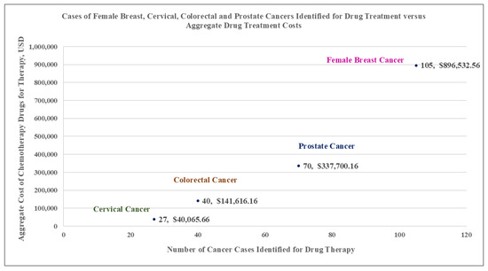 Graph showing the aggregate number of cancer cases versus the aggregate drug treatment costs per cancer type.