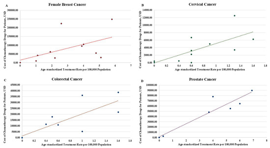 Scatter plots with fitted values showing the association between drug treatment cost (chemotherapy/androgen deprivation therapy) and age-standardized treatment rates (cases treated per 100,000 population) by cancer type: (A) female breast cancer; (B) cervical cancer; (C) colorectal cancer; and (D) prostate cancer. Dotted lines indicate the fitted values of the regression line.